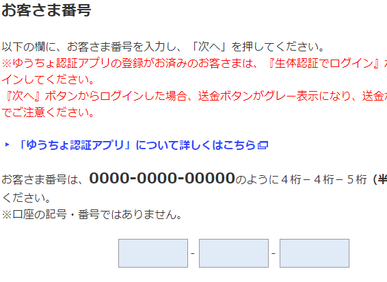 ゆうちょダイレクトに入ると、まずは【お客様番号】の入力を求められる。